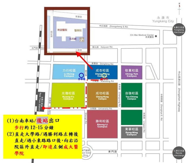 - 停車說明:自費停放成大醫院門診大樓停車場,(停車場入口,位於勝利路及近小東路口)《點我:查詢-成大醫院,汽車剩餘車位資訊》 後,步行小東路(成杏校區)進入成大醫學院(成大醫院當日通道,無法通往成大醫學院)