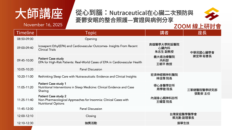 上課通知-114.11.16 大師講座 從心到腦:Nutraceutical在心臟二次預防與憂鬱安眠的整合照護-實證與病例分享