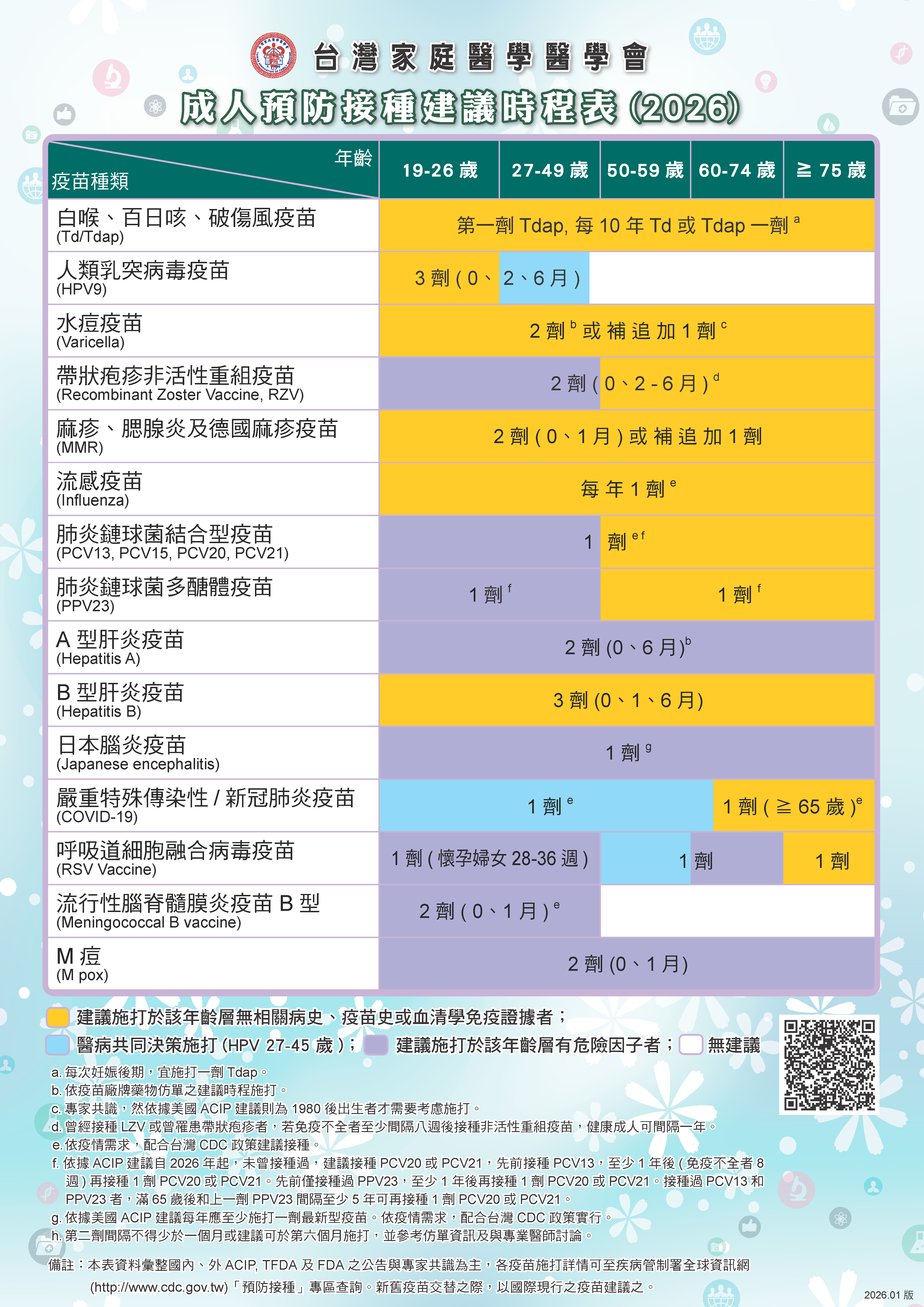 本學會預防保健及慢性病防治委員會彙整國內、外ACIP建議之共識,完成新製台灣家庭醫學醫學會建議之成人預防接種時程表(2026年)如附件檔案,提供各位會員下載參考及運用。