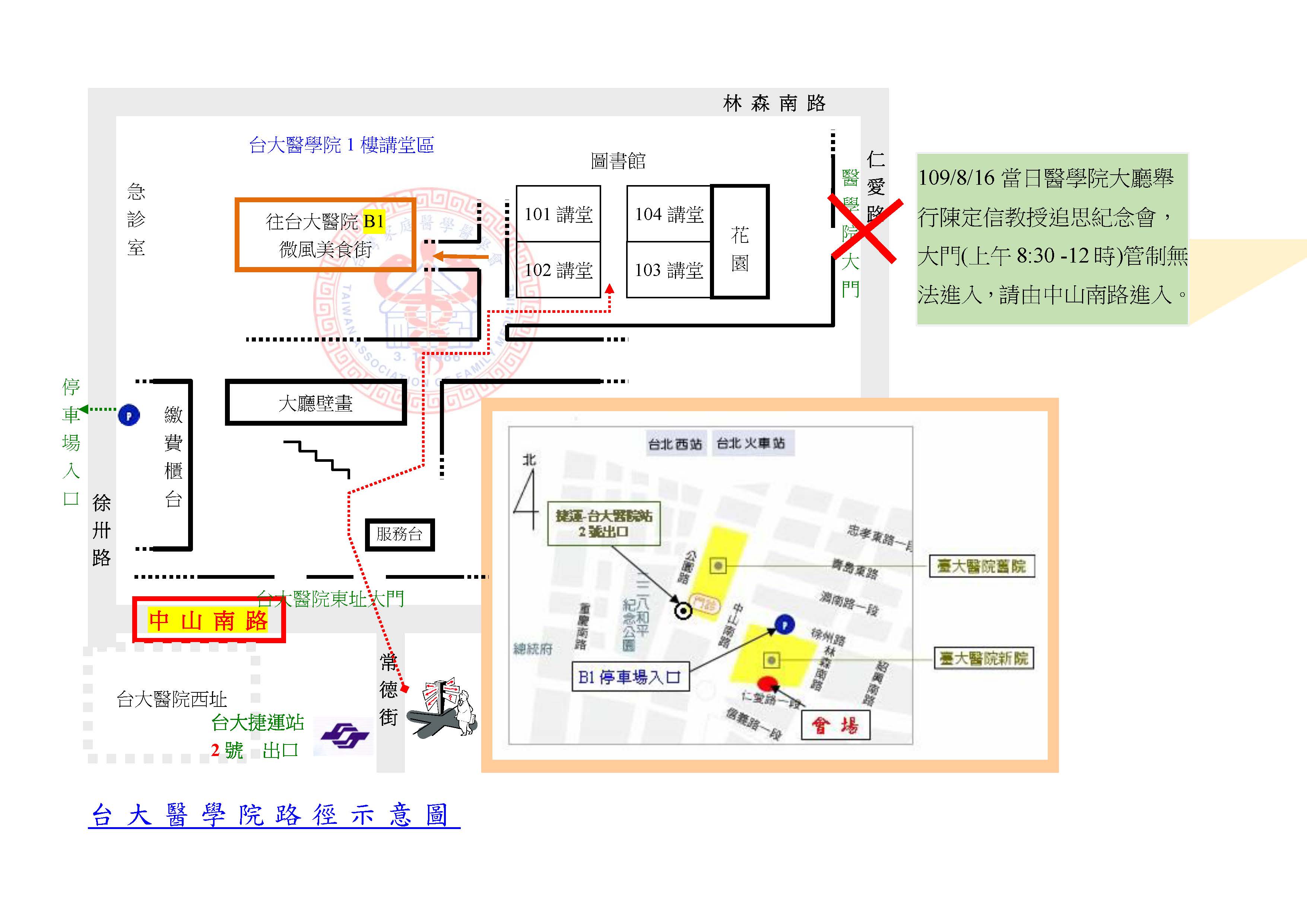 109.8.16(星期日)於台大醫學院104講堂舉行「家庭醫學核心概念課程-生物.心理.社會模式」研討會,當日台大醫學院大廳舉行 陳定信教授追思紀念會,醫學院大門(上午8:30 -12時)管制無法進入醫學院,敬請學員從台大醫院(東址)進入(台北市中山南路7號),敬請攜帶「課前通知單」、「口罩」、「健保卡」前往參加,再依指示立牌到達醫學院104講堂。